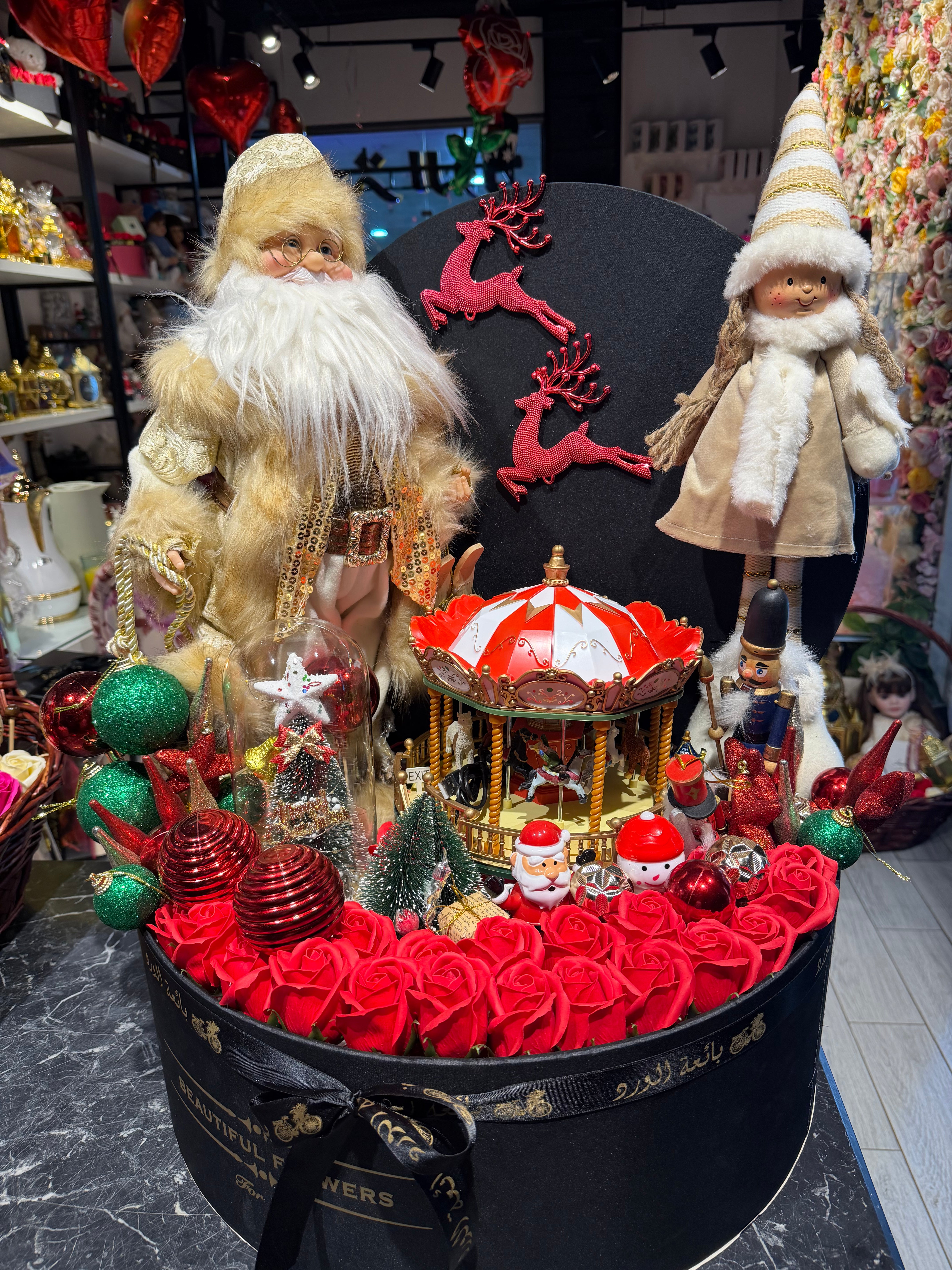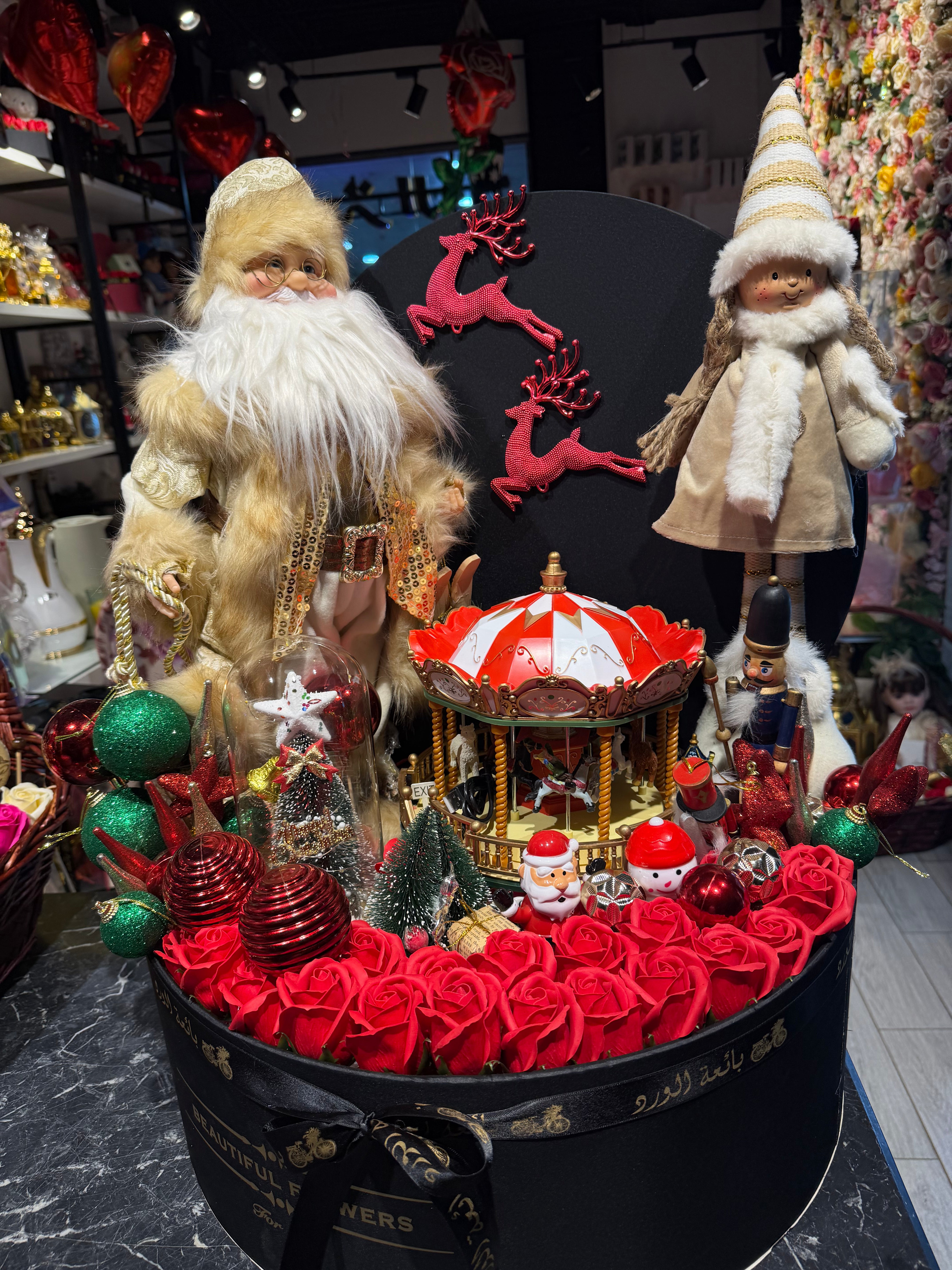 بوكس حجم كبير بالورد سانتا كلوز كبير عروسة ملاهى ميوزك بوكس ديكورات للشجرة بلورة بها شجرة بتنور سانتا كلوز راقص بالطاقة الشمسية وينو مان شجرة صغيرة