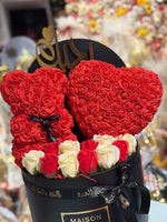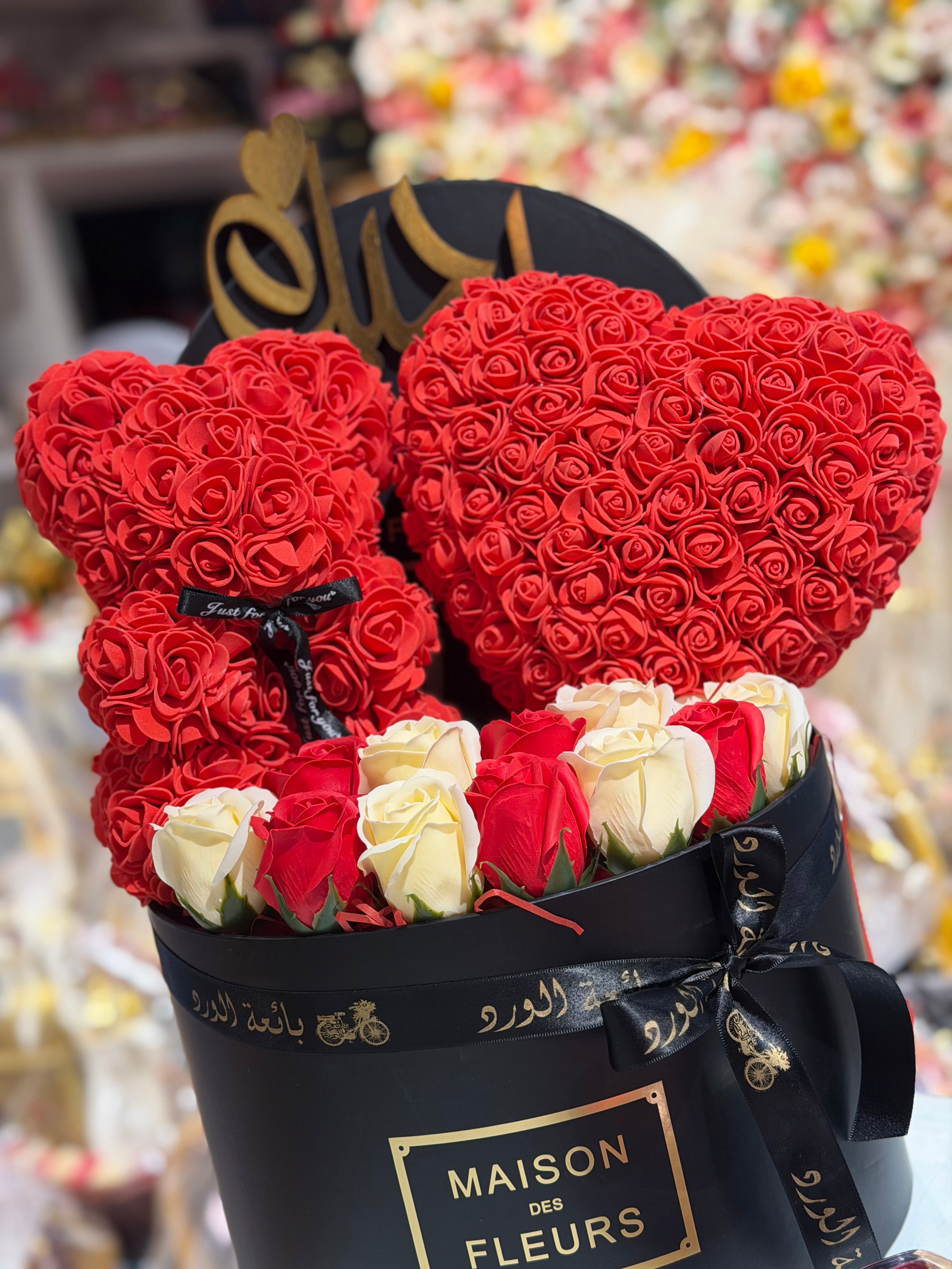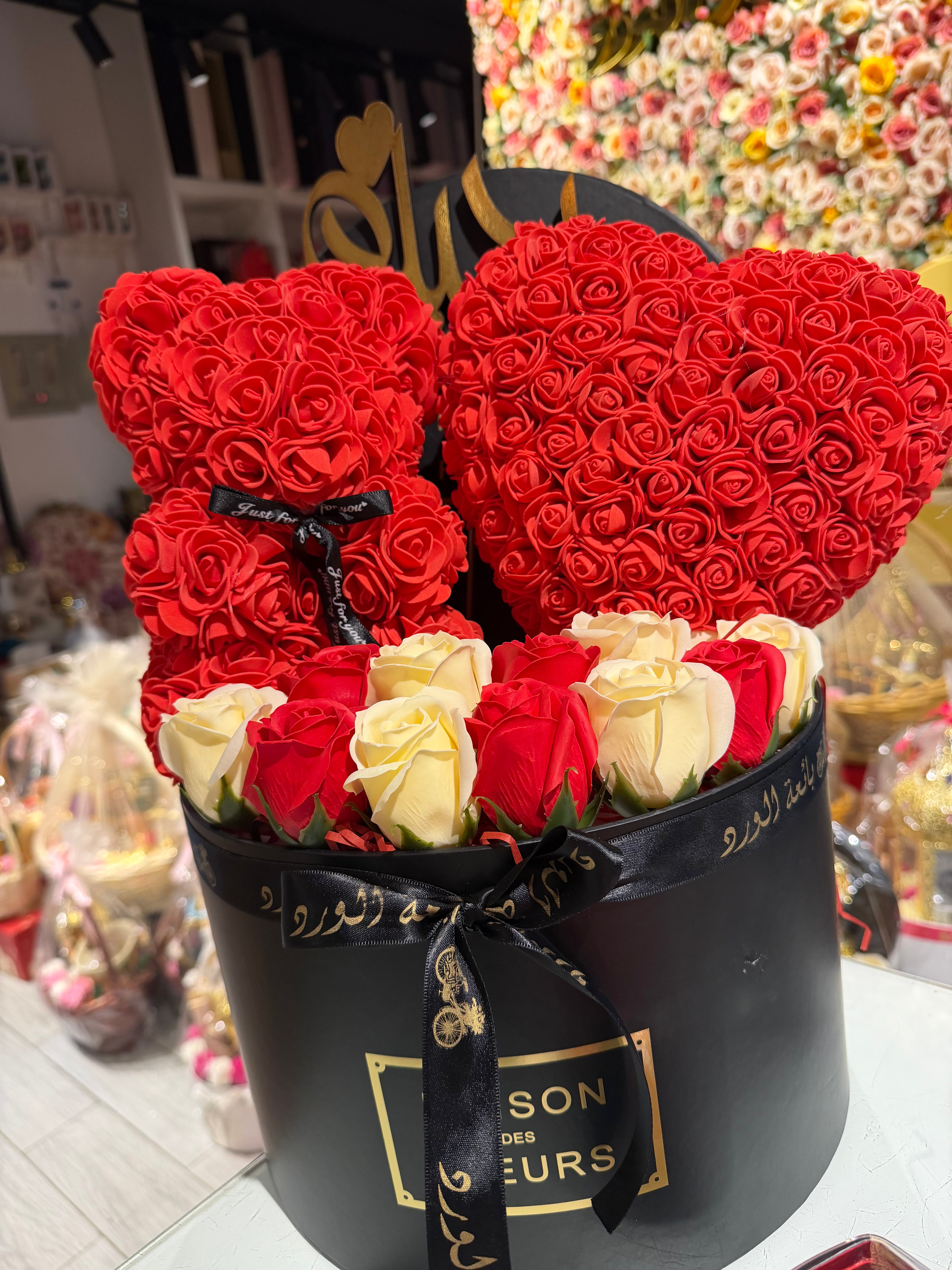 دبدوب بالورد الصناعى ومجسم قلب بالورد الصناعى وهدية عالبوكس خاتم بندورة ورد معطر ورد صناعى