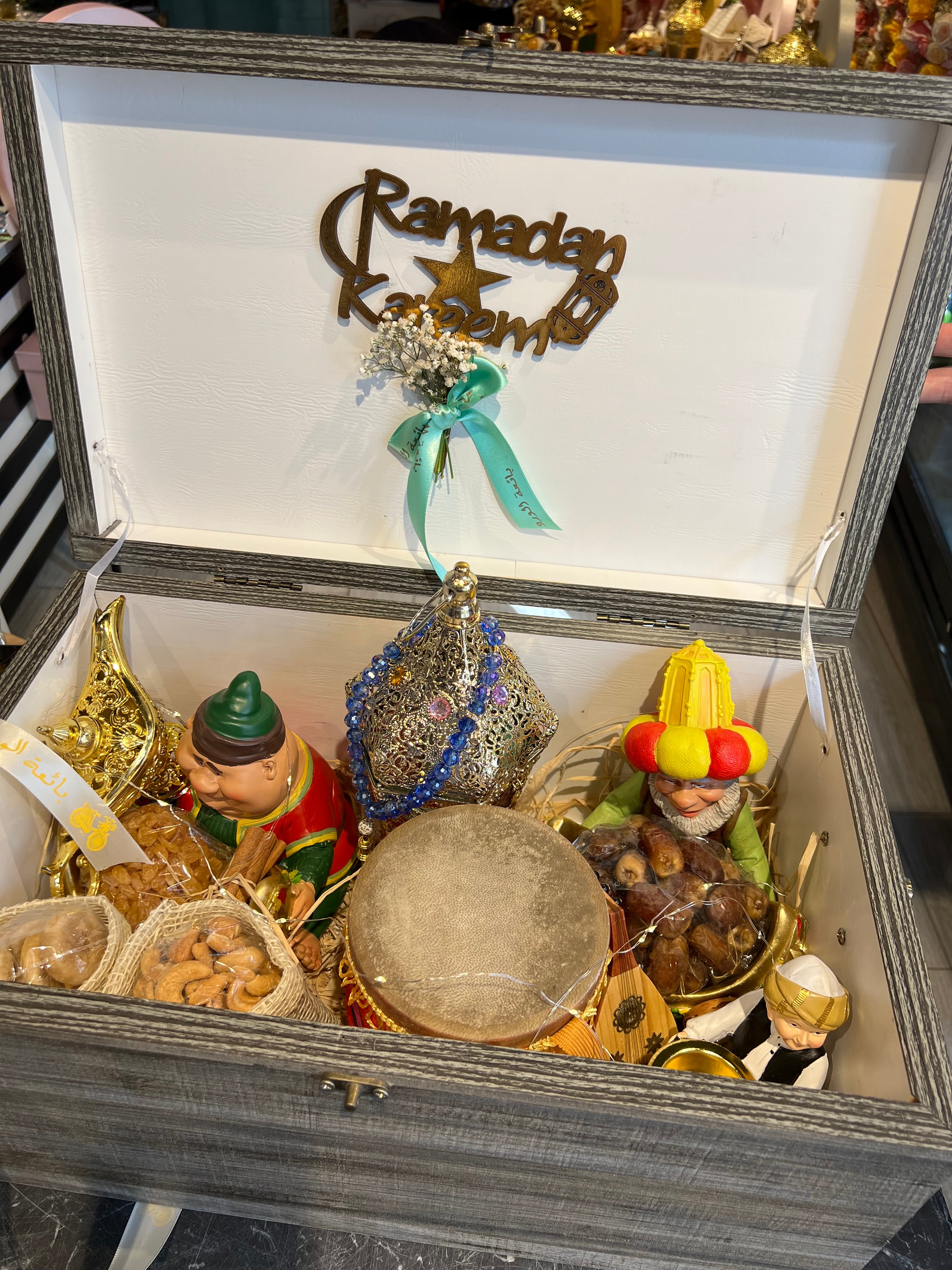 بوكس شكمجية خشب كبيرة فانوس ملكى ياميش رمضان تمر وزبيب وتين وعين جمل مبخرة فنانيس طبق فخار ٢ طبلة مسحراتي سبحة بيبى لايت مصباح علاء الدين عود خشبى ديكور