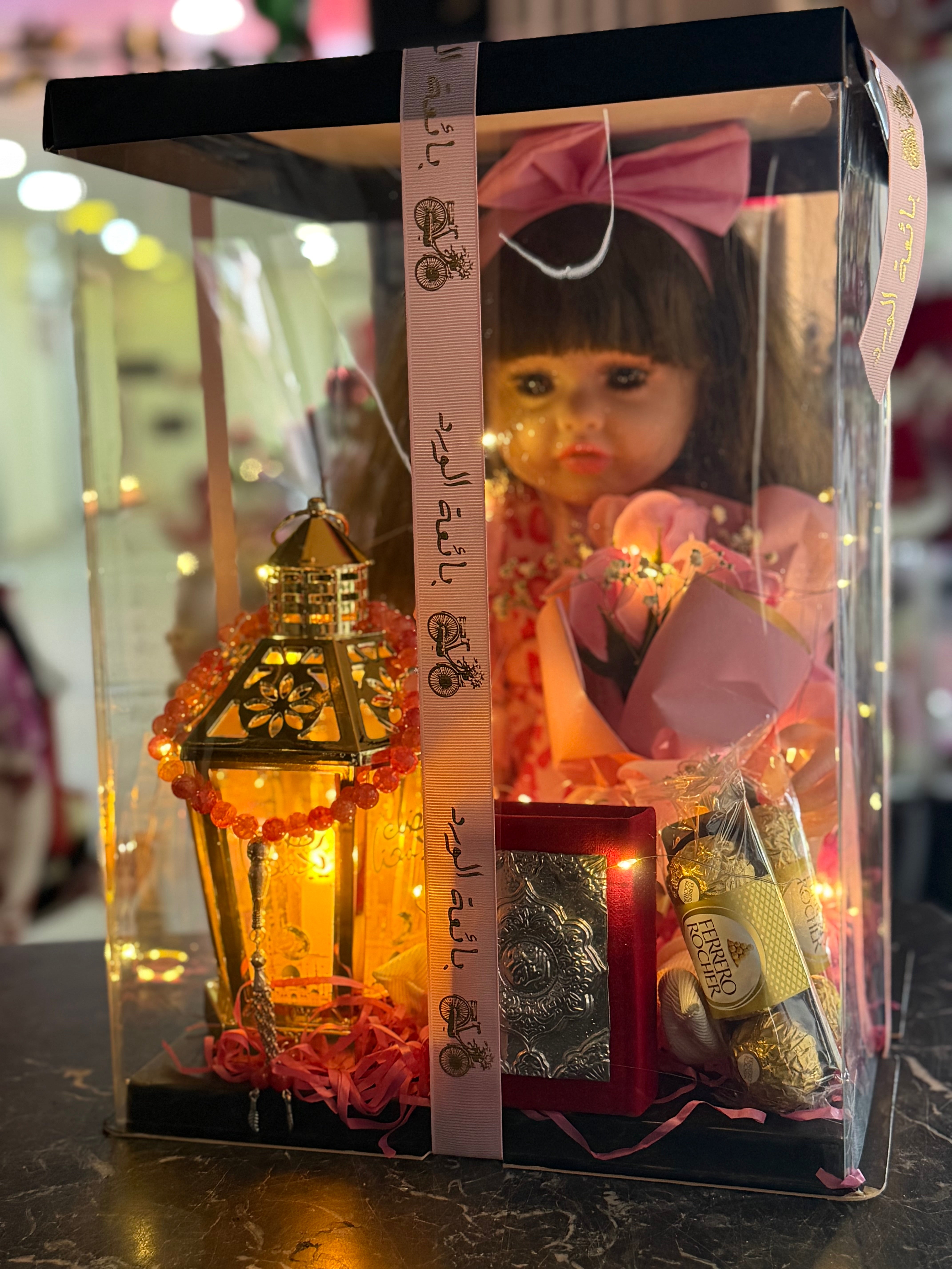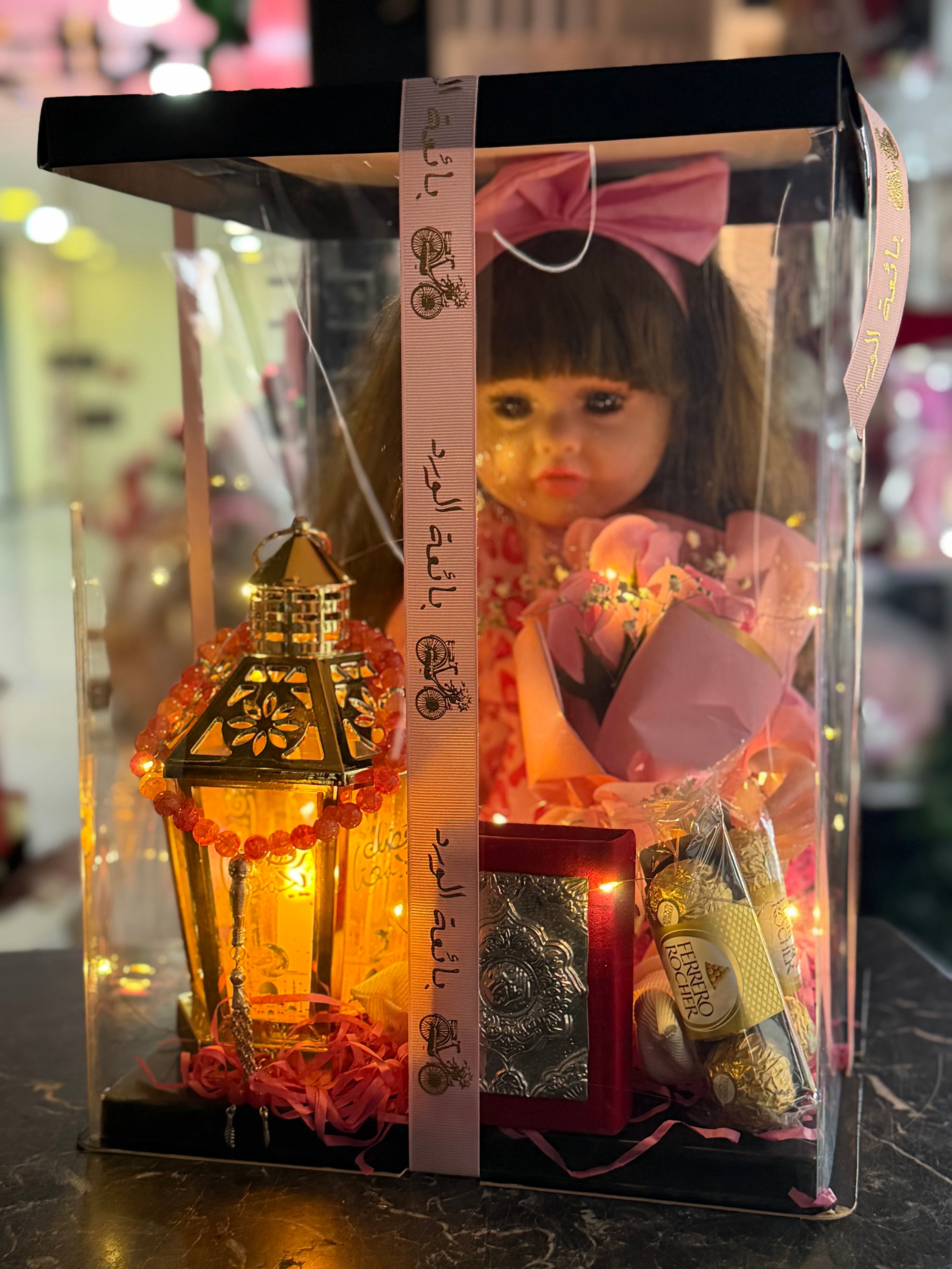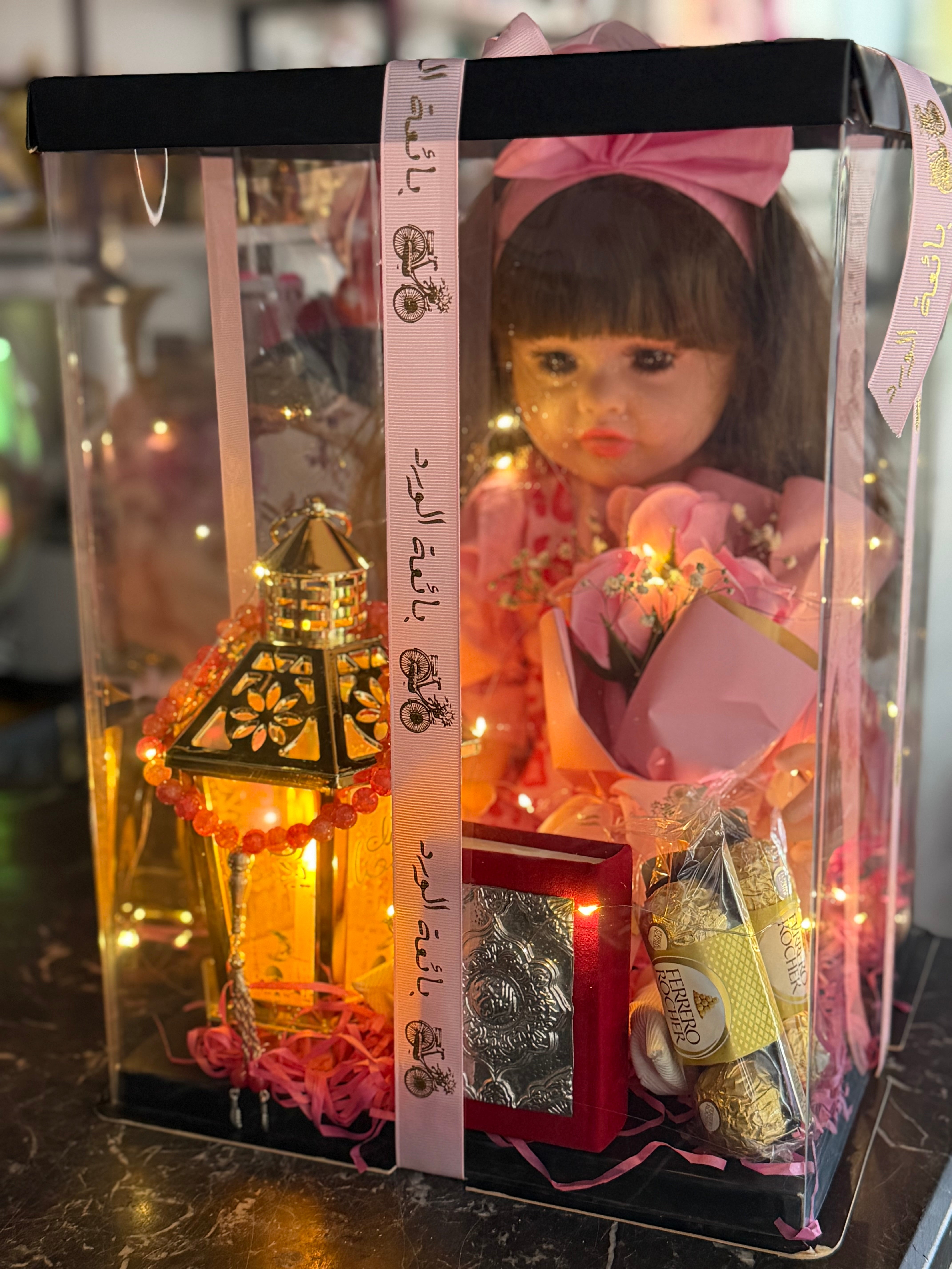 عروسة سيلكون بتغنى رمضان معها فانوس وسبحة وشكولا ومصحف ورد بوكس بينور